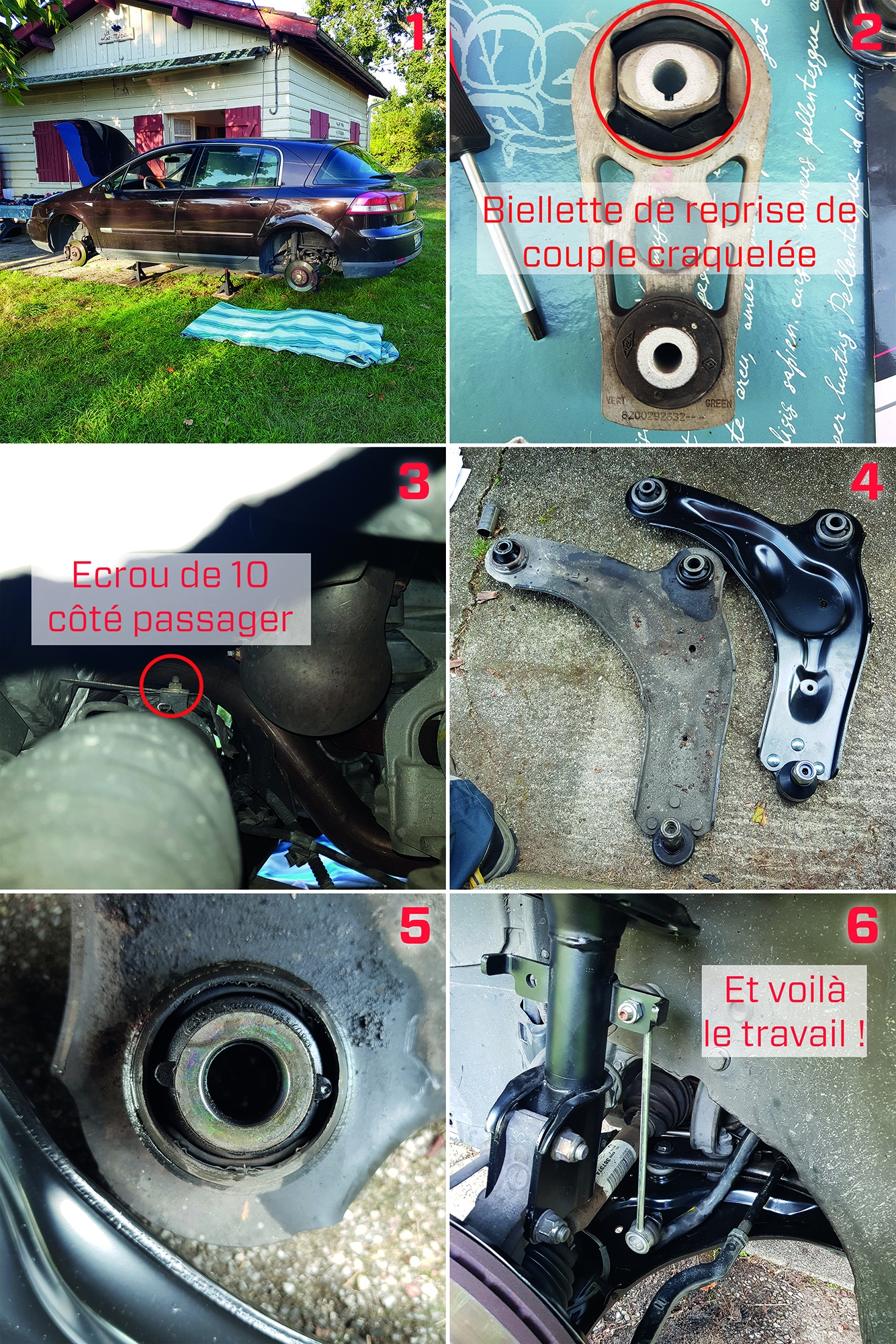A la question : Est-ce qu'on peut le faire sans pont, la réponse est oui, j'avais la voiture sur chandelles (Photo 1) mais si vous n'avez pas de clé à choc (ce qui était mon cas) attendez vous à une séance de muscu pour débloquer les écrous des triangles inférieurs (si vous voulez les changer). Dans le tuto il est indiqué facile pour débloquer les écrous de 30 en dessous des triangles sauf que les miens étaient collés au frein filet d'origine à priori et que j'en ai bavé des ronds de chapeau, j'ai même demandé de l'aide pour tenir l'écrou supérieur qui tourne et en plus qui ripe facilement (bref une galère,quasiment 1 h pour les sortir).
