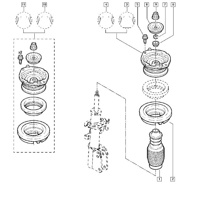 Démonté la coupelle du haut sans retire la roue et remettre l écrou d amortisseur monte la voiture enlevé la roue retire la biellette de la barre stabilisatrice juste celle qui se fixe sur l amortisseur biellette de direction et enleve les 2 vis de l amortisseur sa sort très bien compressé le ressort retiré l écrou du haut vous allez pas pouvoir retire la coupelle il y a un écrou à retiré avec une clef à pipe perce moi j' ai coupe autour et après avec la clee à œil après pour remonte j' ai mis des coupelles de la marque kyb c est pas le système que Renault sur la photo de Jean Louis plus haut c est celui de droite l ancien et j' ai mis celui de gauche pour le remontage faut faire pareil ne pas mettre la petite coupelle juste le boulon central tout fixé le bas et remettre la roue et des que l amortisseur est fixé en bas et en haut retire l écrou central et mettre la petite coupelle avec l écrou et serre