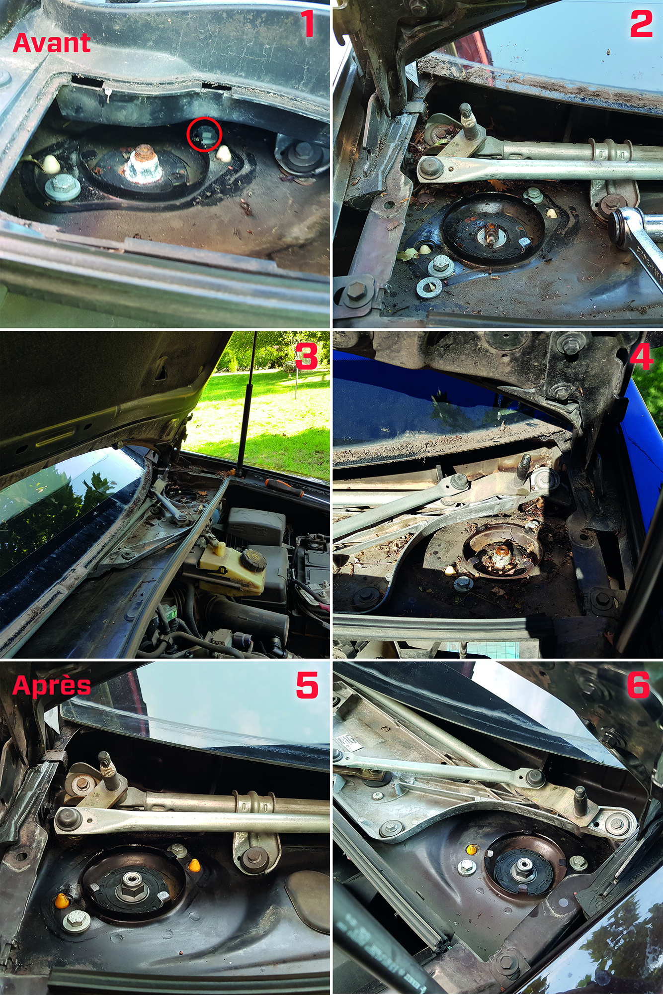 J'ai donc décidé de déshabiller tout le compartiment en enlevant les essuie-glaces et le cache plastique (en 2 parties). L'opération est très facile à réaliser et pour le coup j'ai bien fait parce que je me suis aperçu que dans la partie creuse derrière l'amortisseur s'étaient accumulées tout un tas de saloperies qui empêchaient un écoulement franc des eaux de pluies (Photos de 1 à 4).