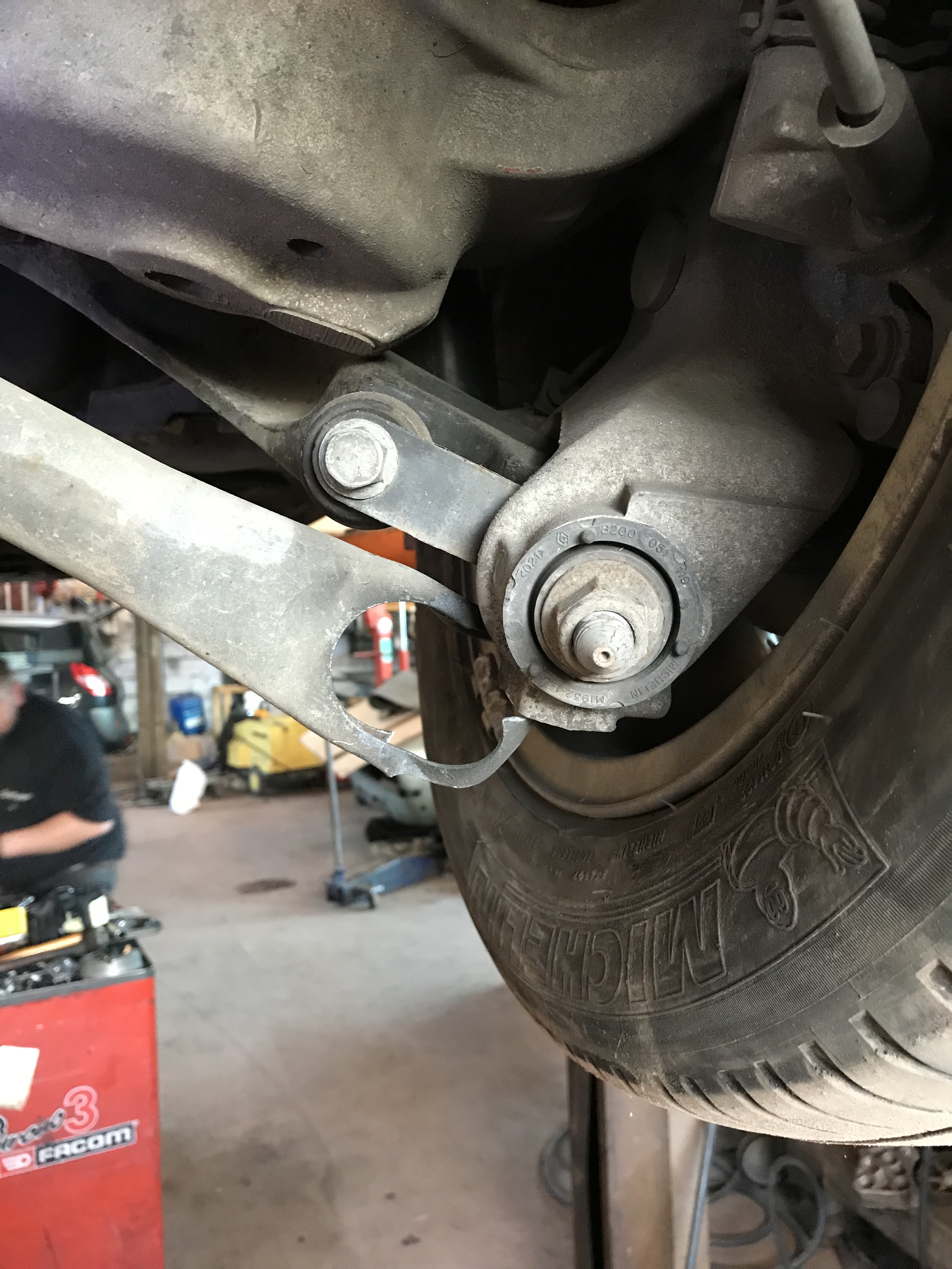 Au moment de mettre l’auto sur le pont, je rentre dans le garage roues braquer à fond pour pouvoir manœuvrer et là c’est le drame Le Bras casse net!!