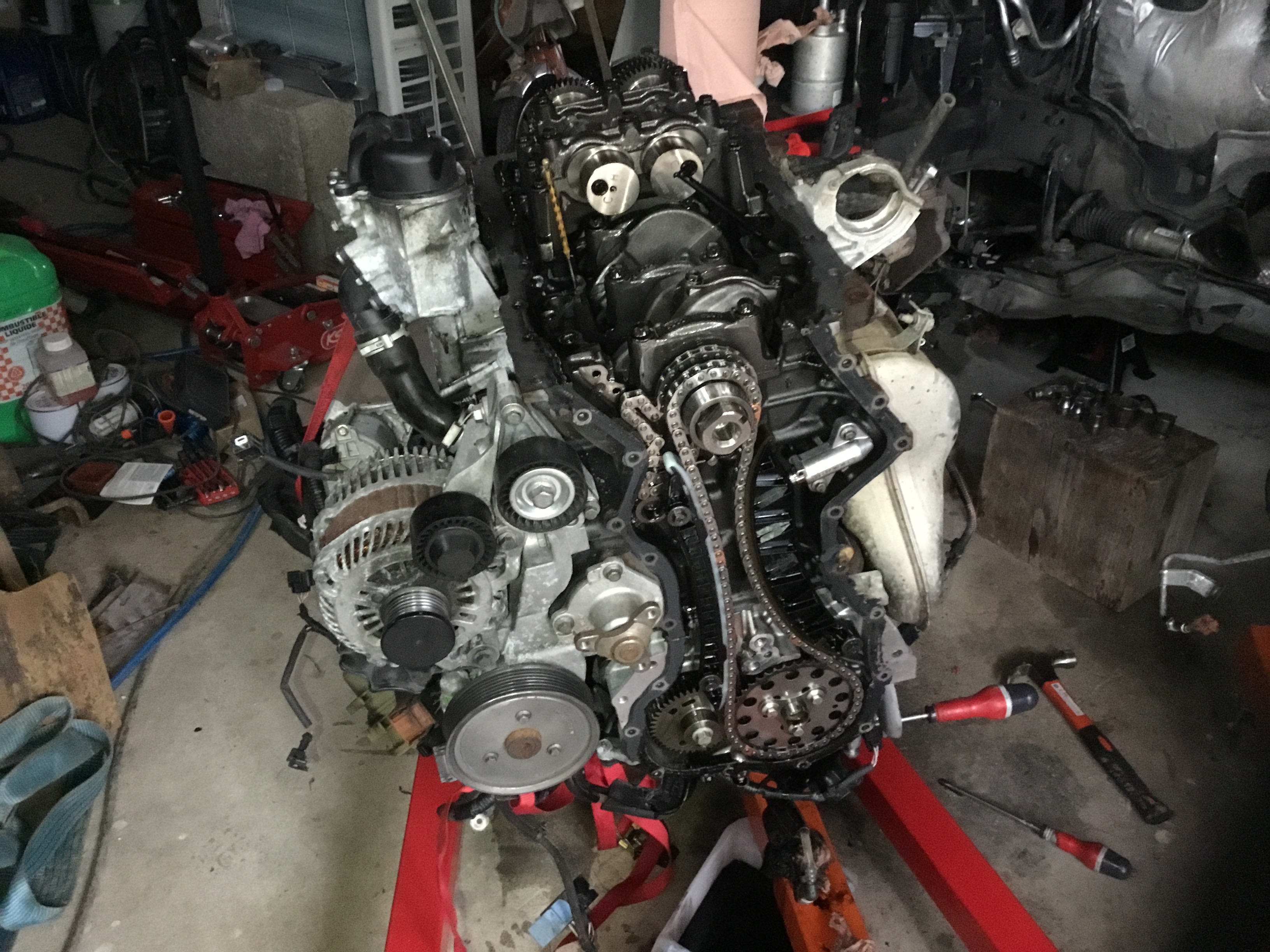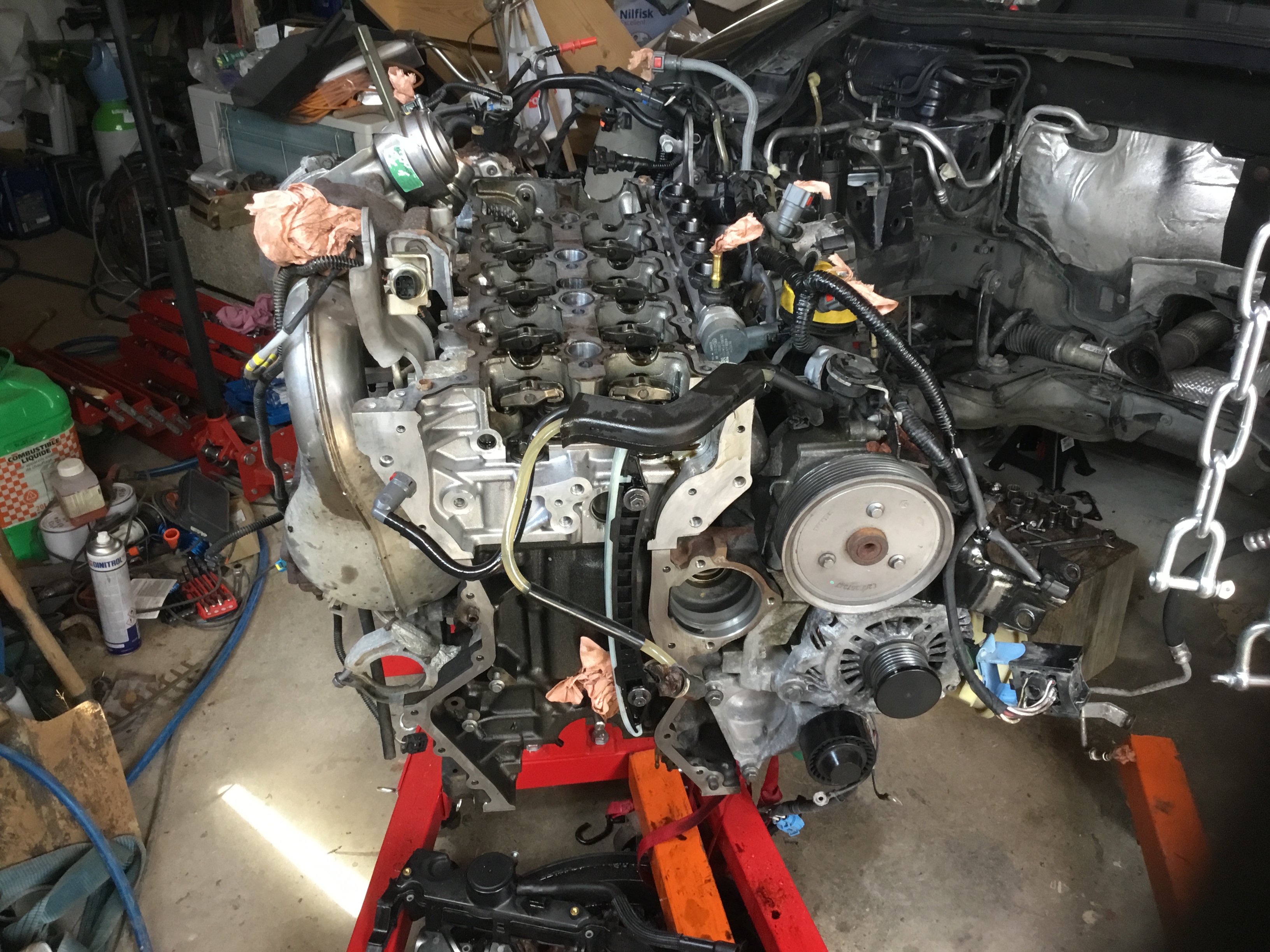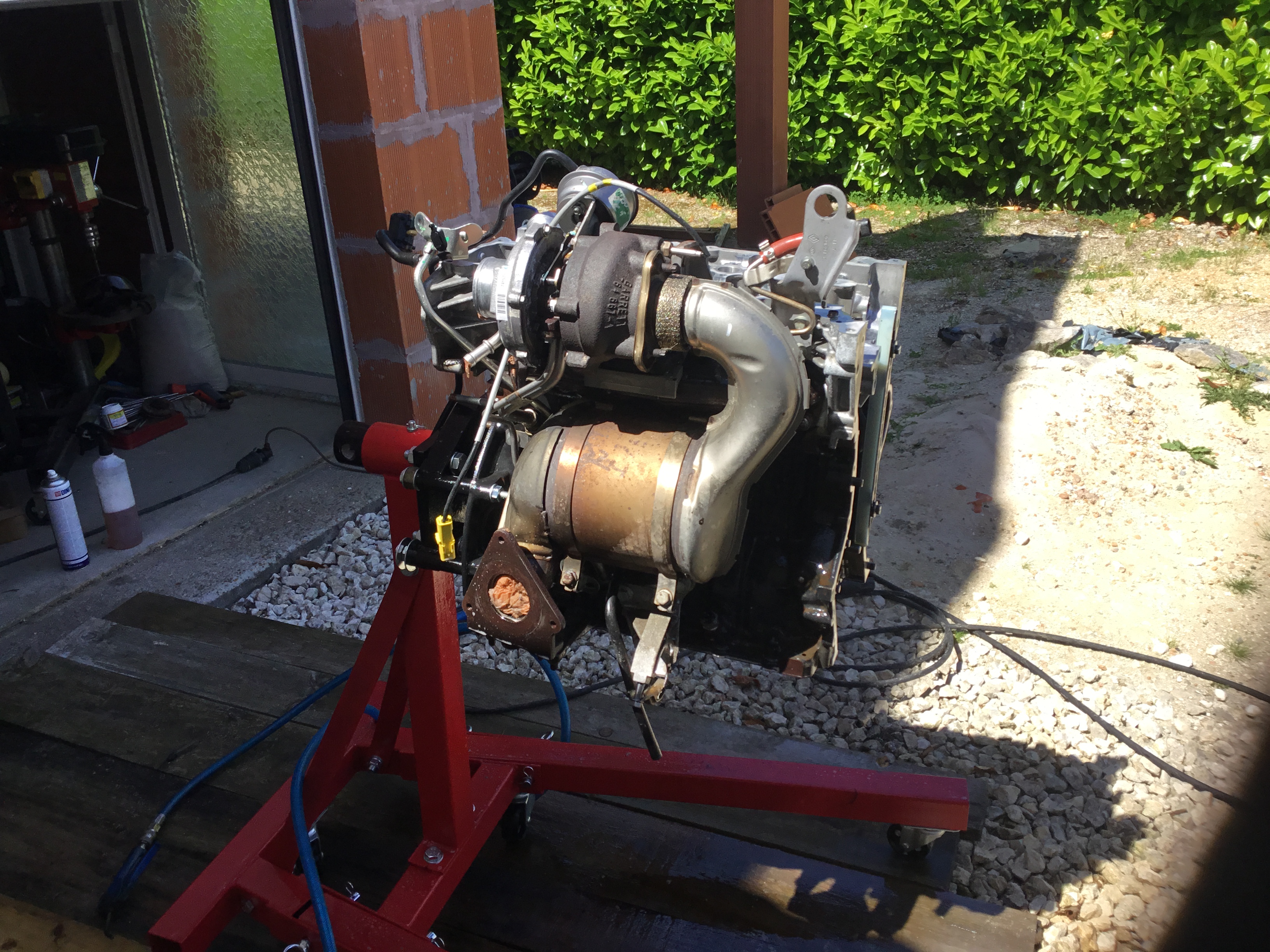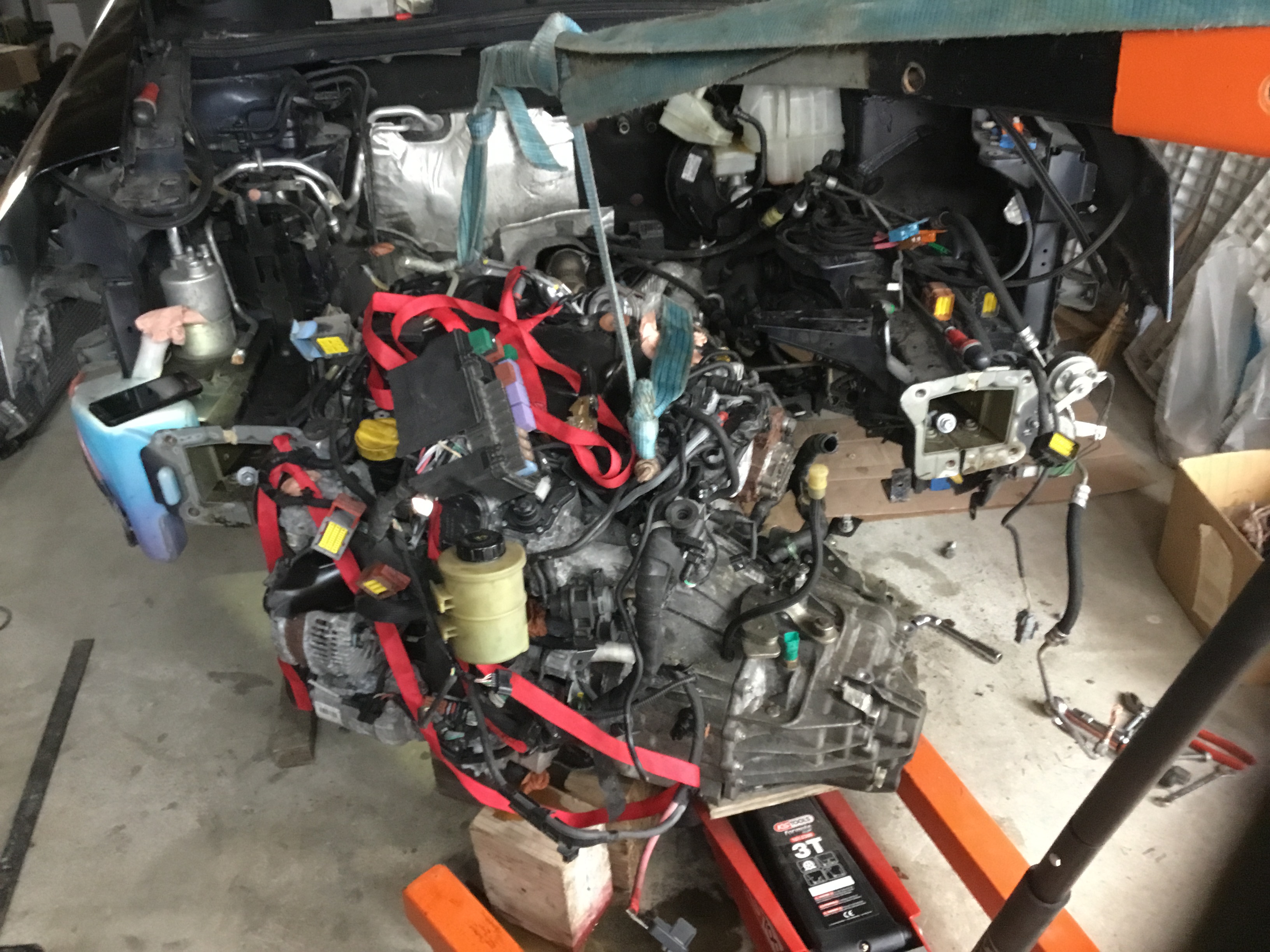 Juste quelques précisions pour la sortie du moteur/boite de la voiture , l’ideal etant d’avoir un plateau roulant bien costaud , mais ajustable en hauteur , et la c’est le top je pense , la je me suis embeté avec la bique , la baie de parebrise est aussi genante que sur l’espace 4 (pour l’avoir deja fait dessus ), dans le coup il faut un petit tube carré sur la bique et une sangle /chaine assez courte pour que ca passe .... mais bon ca l’a fait quand même sans rien abimer :smile:
