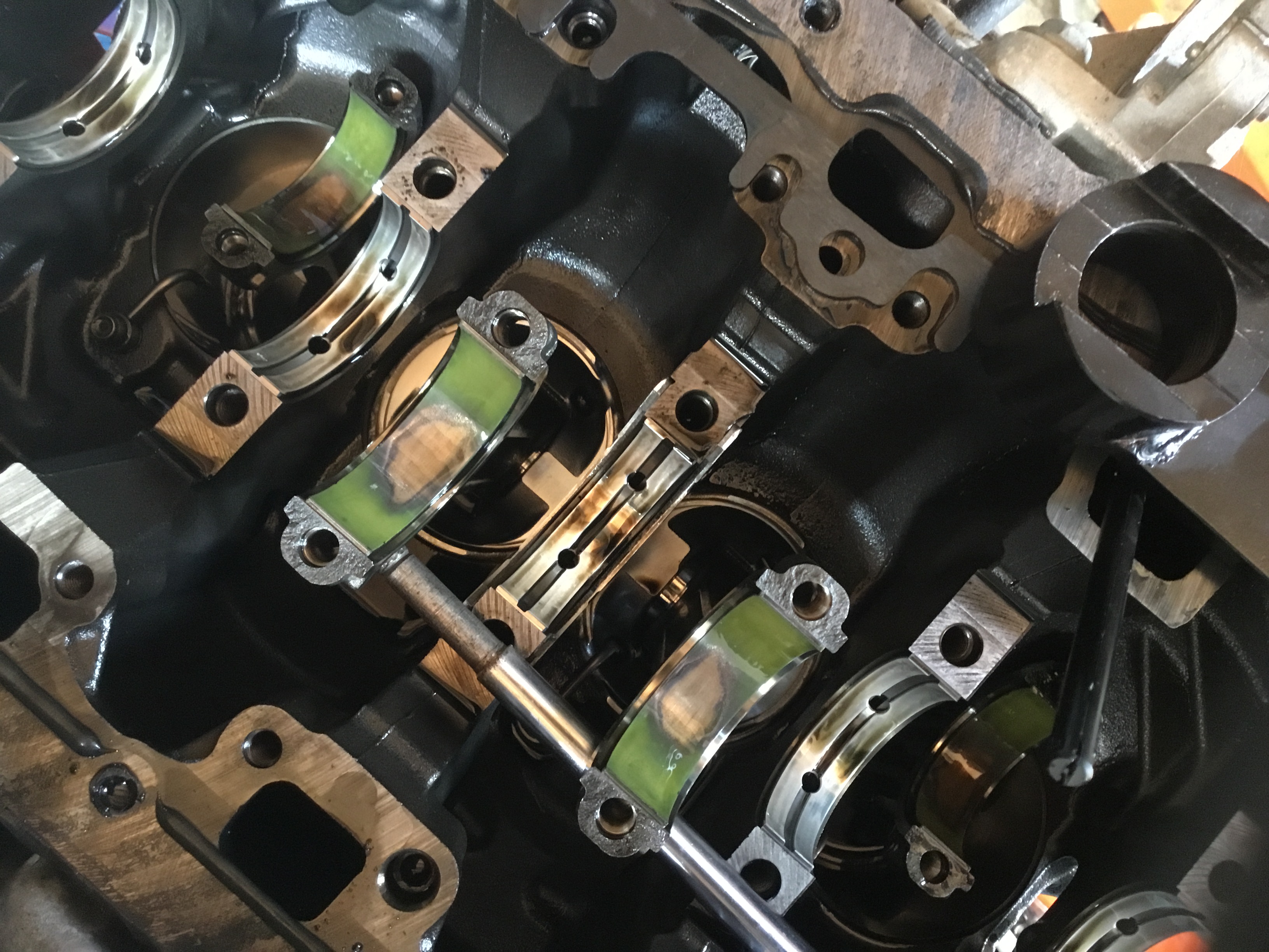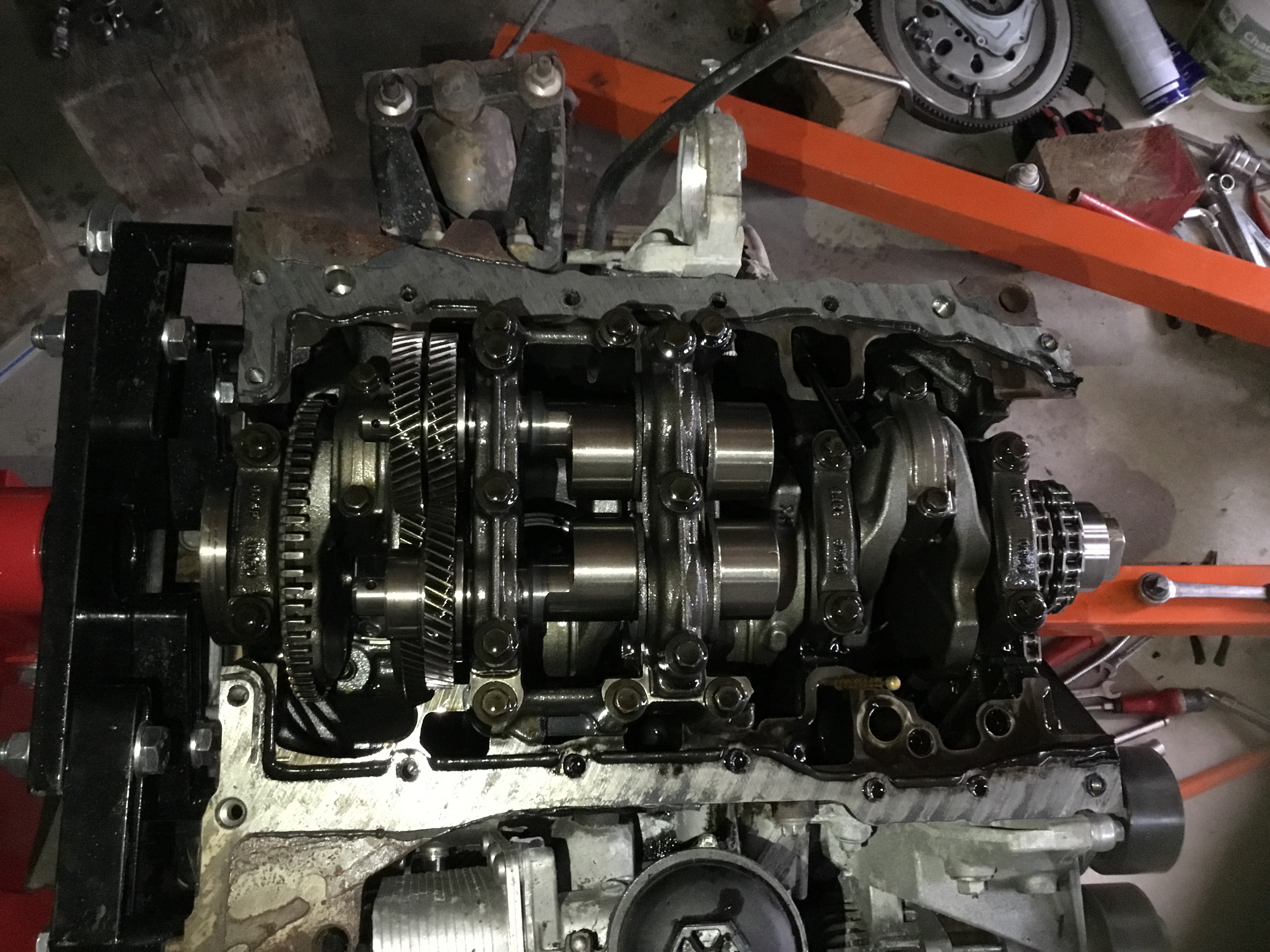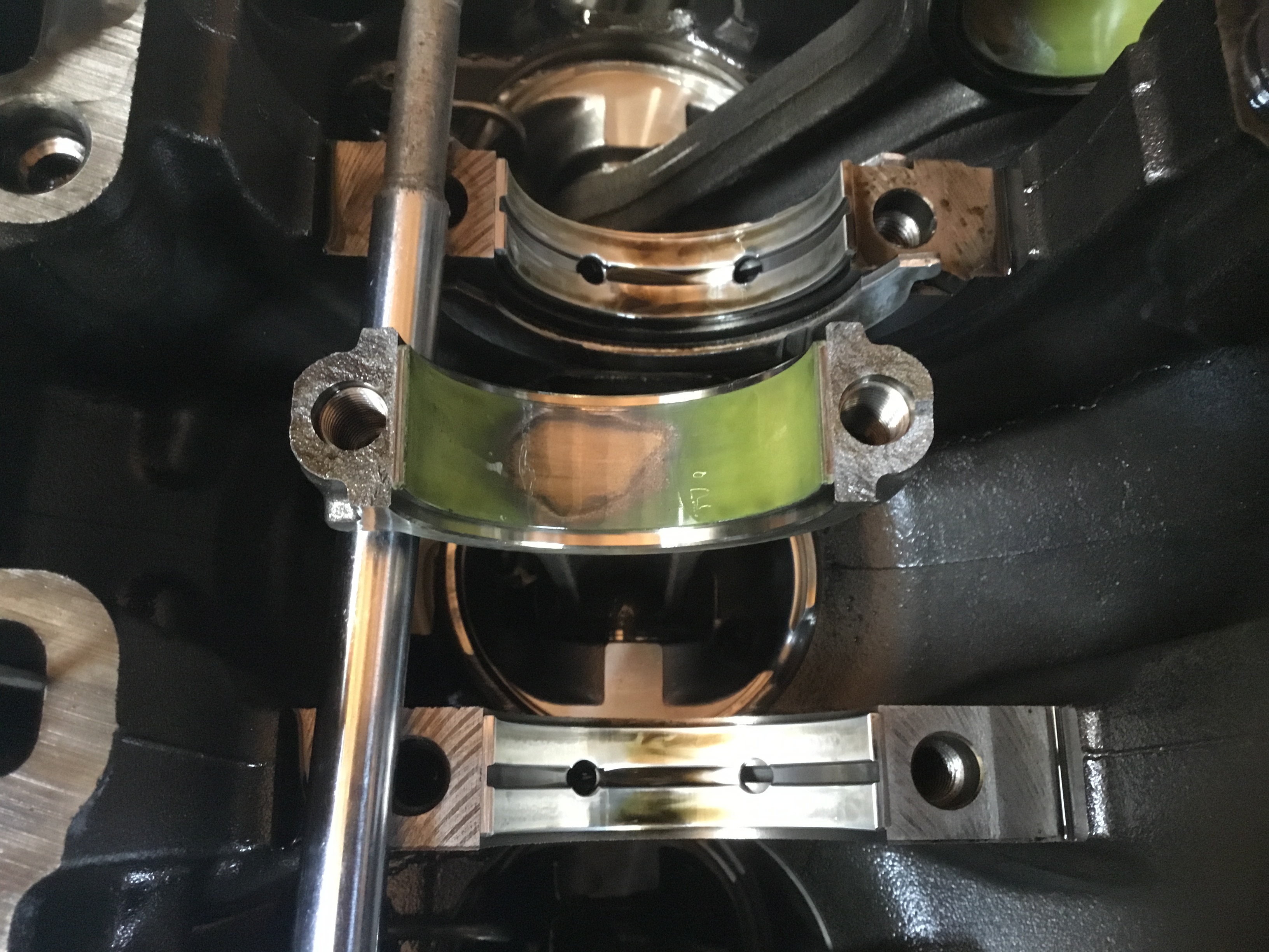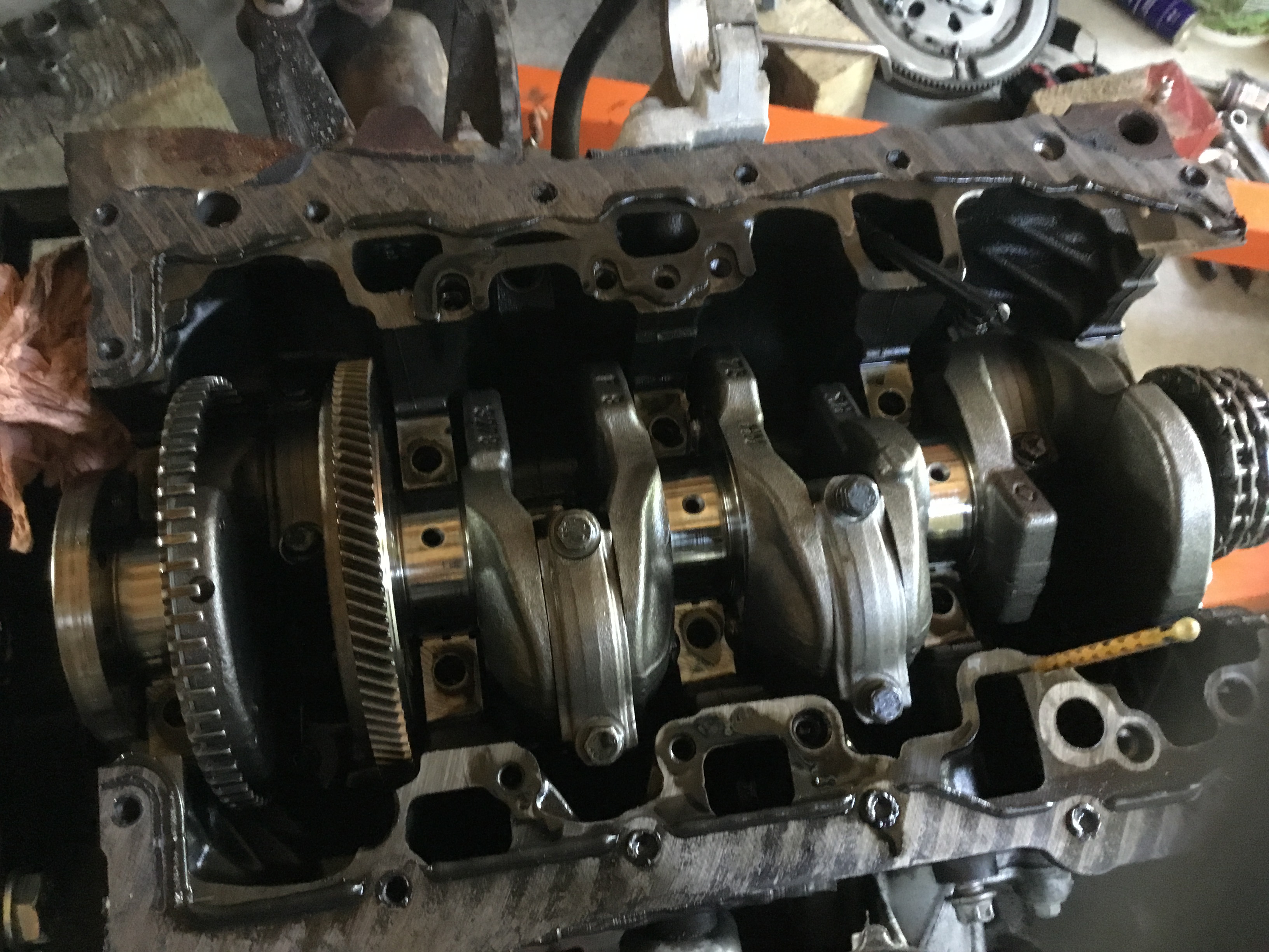 Je vais en profiter pour jeter un oeil aux coussinets de bielles et aux coussinets de paliers de vilebrequin , car les ingés sont tellement intelligents qu’ils ont été visser le carter d’arbres d’equilibrage du vilebrequin avec le support de la bague etanche derriere le volant moteur , vachement pratique pour acceder aux paliers ... :cry: