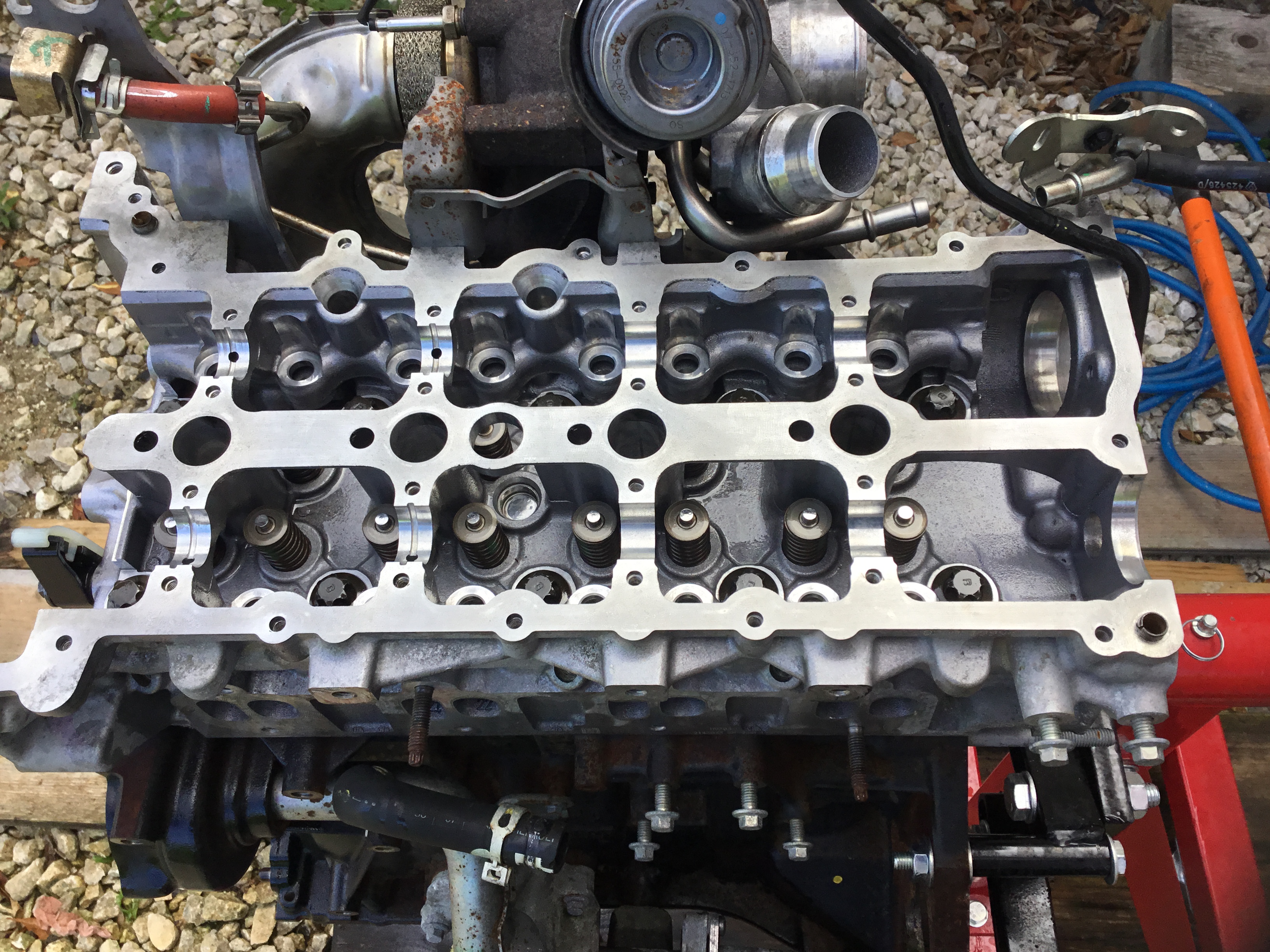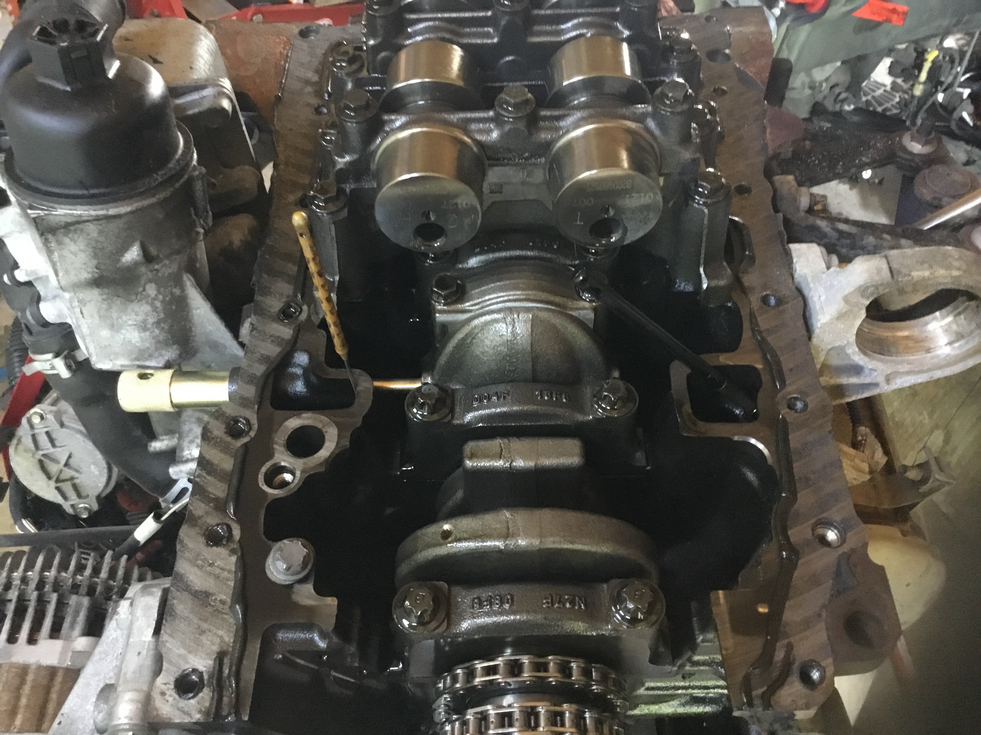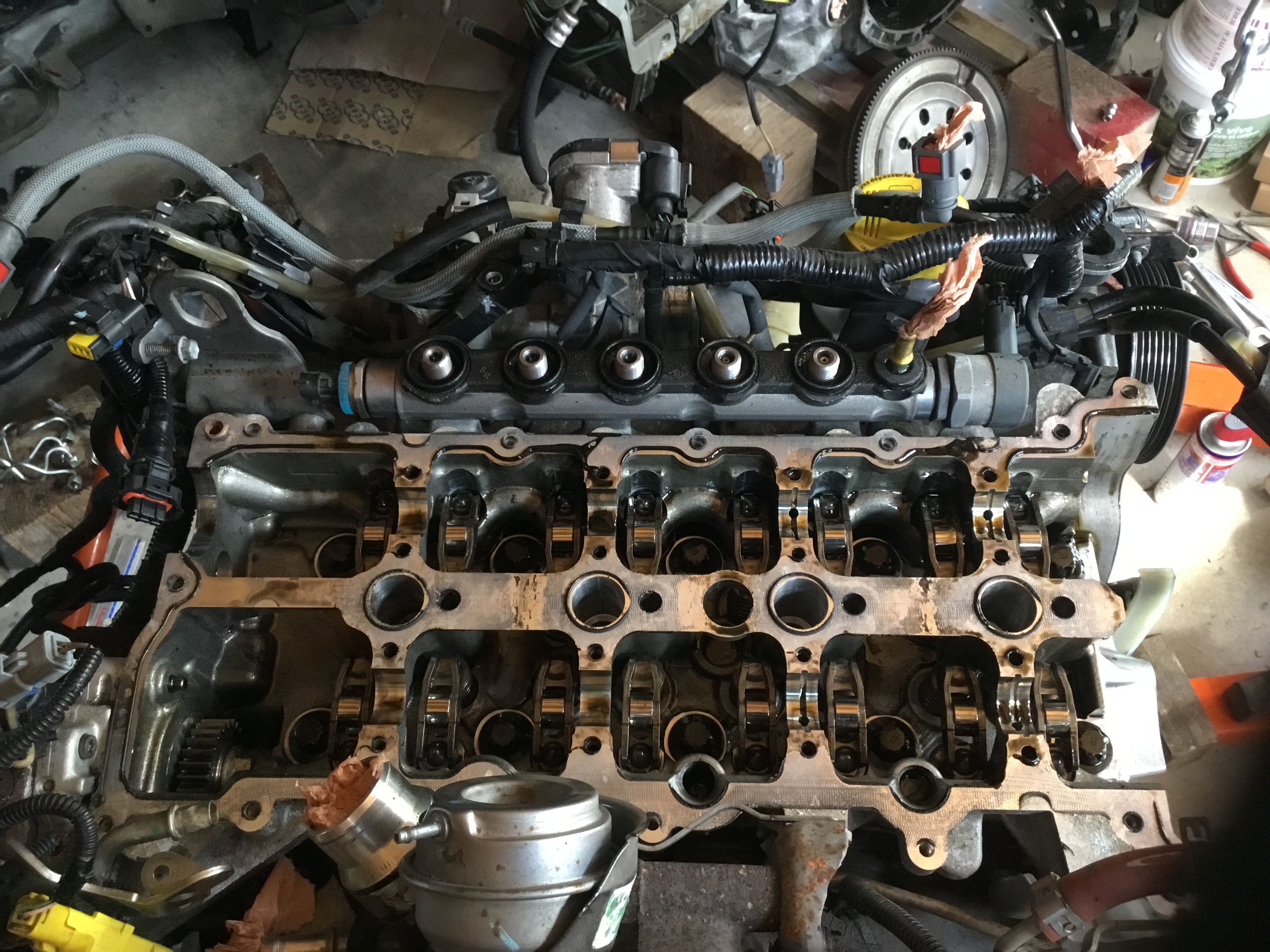 Ce matin , j’ai voulu nettoyer la partie haute du moteur , ayant eu peur de faire tomber des morceaux de mastic dans la culasse , j’ai démonté le couvre culasse et les injecteurs , voici les photos , il n’y aura que du mastic a remettre et des joints d’injecteurs neufs 😉